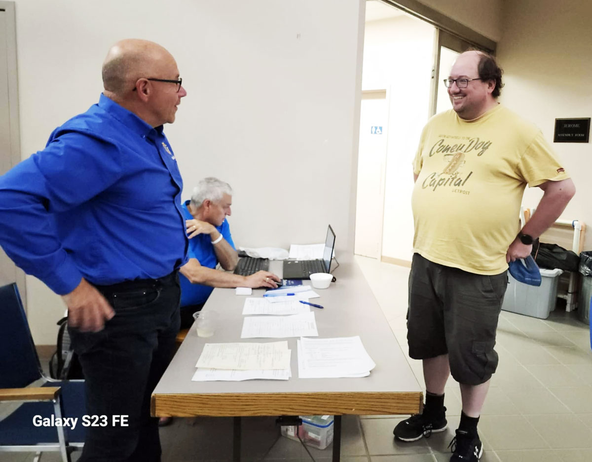 Fr. Gregory Roth of Saskatoon (right) at the registration desk. (Photo courtesy of Saskatchewan State Council)