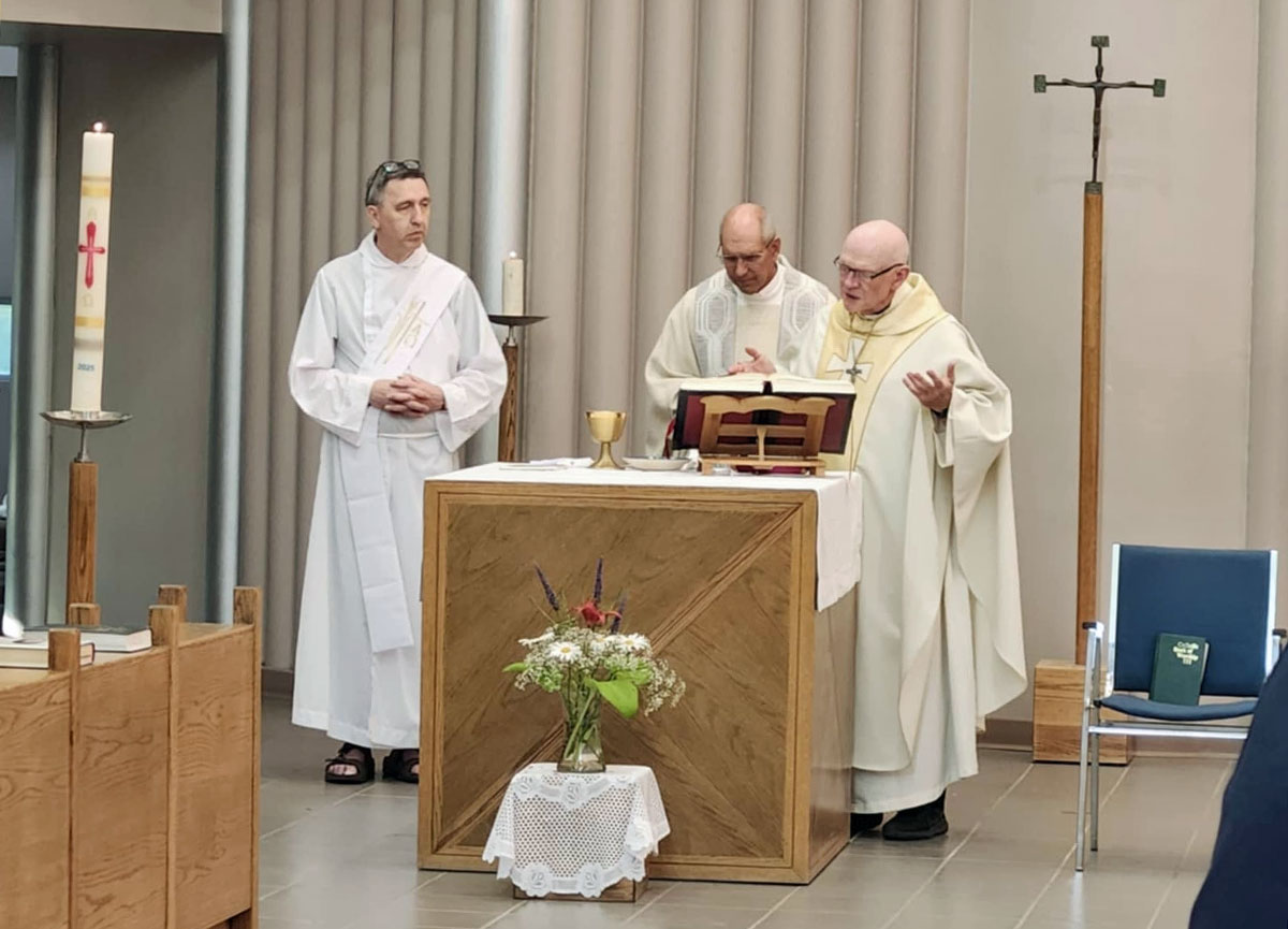 Saskatoon Bishop Mark Hagemoen (right) and Archbishop Donald Bolen of Regina (centre) preside at celebration of Mass during K of C Clergy Sports Days, with Deacon Nicholas Blom (left) of St. Mary Parish, Saskatoon. (Photo courtesy of Saskatchewan State Council)