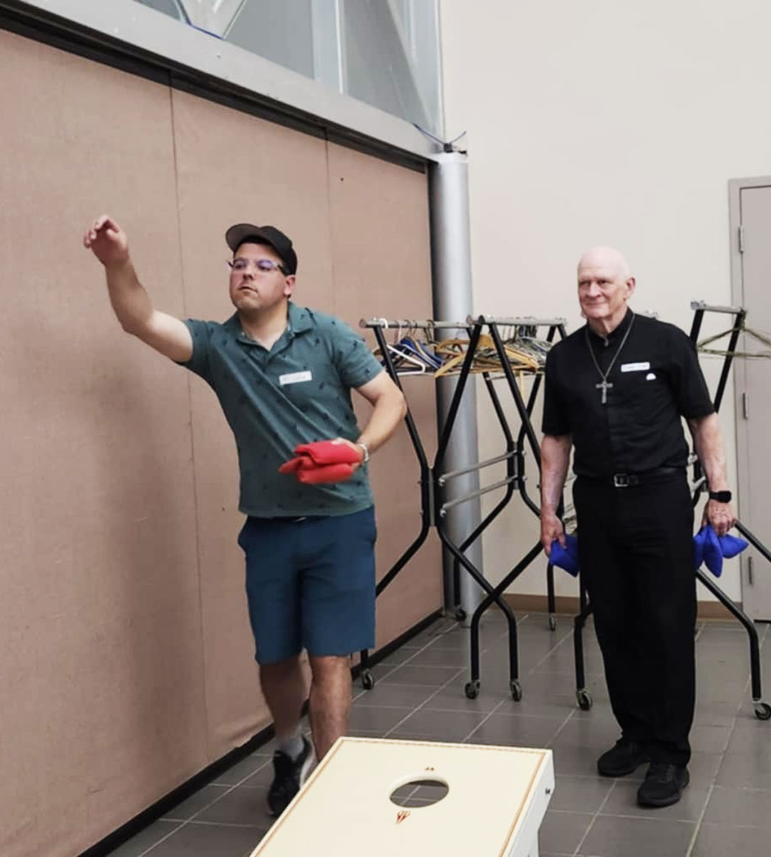 Fr. Colin Roy of Humboldt tossing bean bags with Bishop Mark Hagemoen. (Photo courtesy of Saskatchewan State Council)
