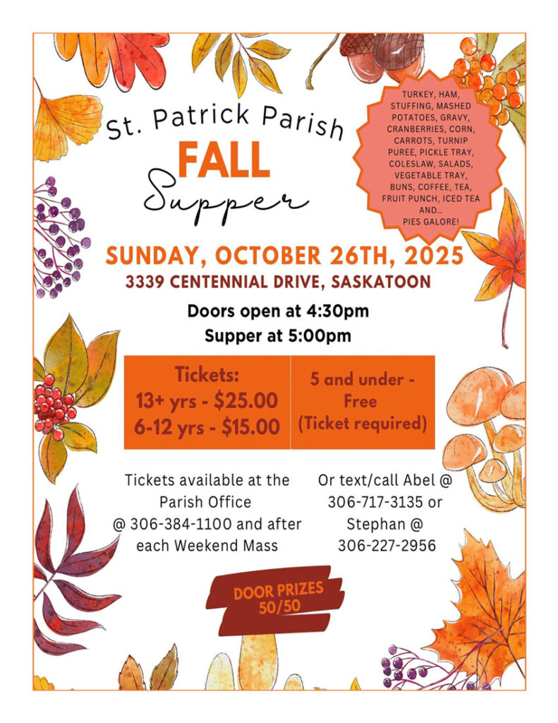 St. Patrick Fall Supper will be held Sunday, Oct. 26 at the parish centre, 3339 Centennial Drive, Saskatoon: doors open at 4:30 p.m. with supper at 5 p.m. Tickets are $25 each for all those over 13 years of age; $15 for those 6 to 12 years; and free for those 5 years and under (however, ticket is required.)