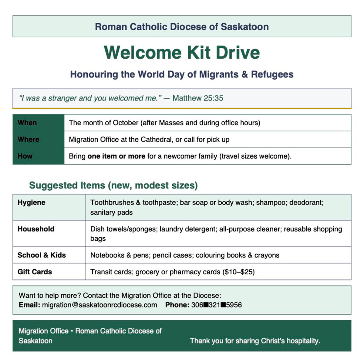 For more information about private refugee sponsorship by parishes and groups in the Roman Catholic Diocese of Saskatoon, or how you can help, please contact the Office of Migration migration@rcdos.ca